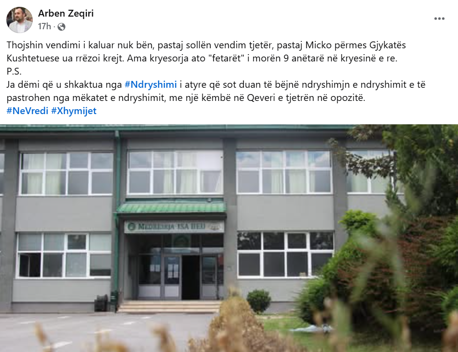 ëdhënësi i ASH-Taravari, Arben Zeqiri përmes një postimi në profilin e tij ka reaguar ndaj vendimit të gjykatës kushtetuese ku u shfuqizua ligji për themelimin e Medresesë “Isa Beu” në Shkup. Zeqiri në postimin e tij shkruan se ata “fetarët thojshin vendimi i kaluar nuk bën, pastaj sollën vendim tjetër, pastaj Micko përmes Gjykatës Kushtetuese ua rrëzoi krejt. Ama kryesorja ato “fetarët” i morën 9 anëtarë në kryesinë e re”, shkruan Top24